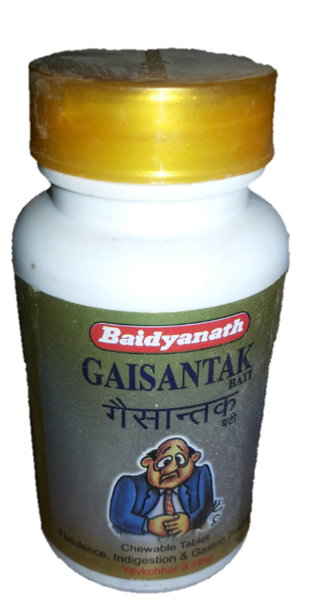 Gaisantak Bati is unique formula developed by BAIDYANATH research center ( Jhansi ) to overcome problems related to GIT (Gastro intestinal tract ). It relieves Bloated stomach, Gase formation, indigestion and Hiccups, GI cramps.