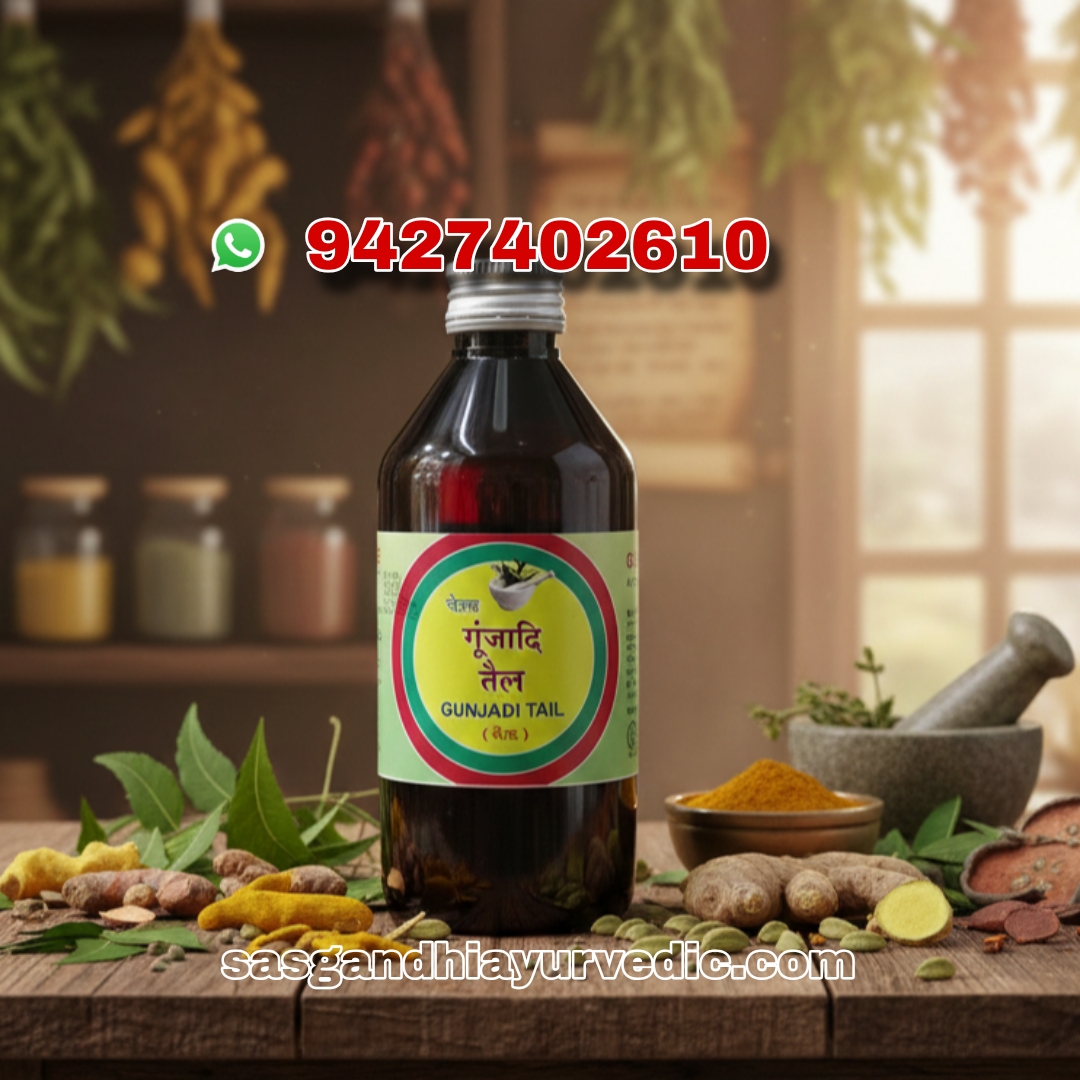 Chetak Gunjadi Tailam is a medicinal hair oil with active extracts of Gunja (Chanothi/Abrus) and other herbal extracts in 100% Shodhit Till (Sesam) oil. Gunjadi tail is very effective formulation for hair diseases. It is very helpful treatment along with Dhaturpatradi tailam, Nilibhringraj tailam and Dirgh Kesha tailam. It maintains lusters of hair by preventing its falling, splitting and environmental pollutant damage. It is very effective for Baldness due to environmental pollutant and heavy metal rich water for hair washing. You should always insists to use Sanjivani Herbal Shampoo to wash your hair when use Gunjadi tailam.