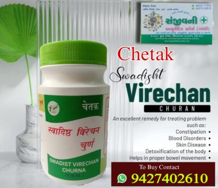 Chetak Swadist Virechan churna is a classical ayurvedic medicine for constipation, stomachache, gastritis and mouth ulcer.