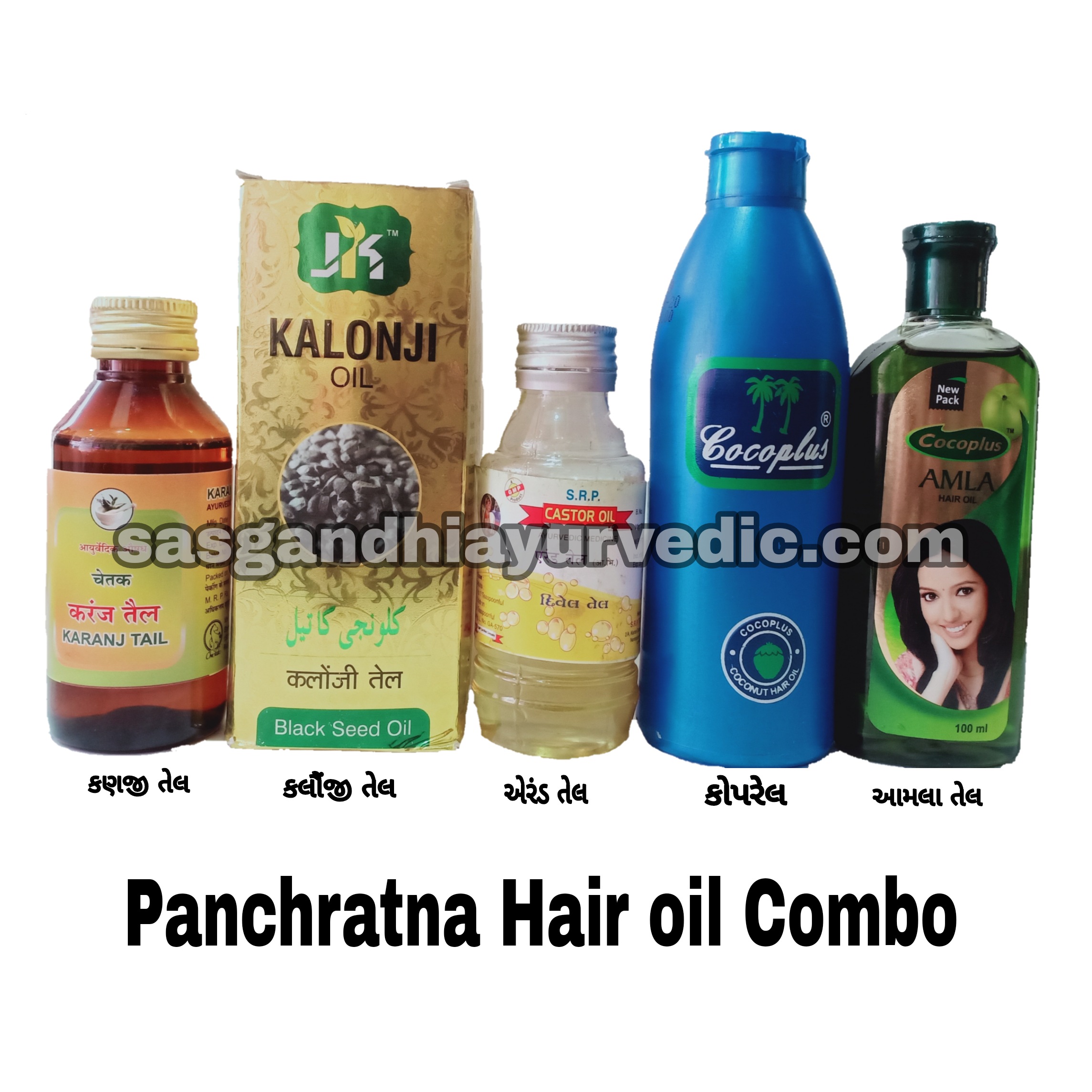 Panchratna Hair oil combo contains five Ayurvedic oils, viz., Kalonji Oil, Karanj (Kanji) Oil, Coconut Oil, Castor Oil and Amla Oil.